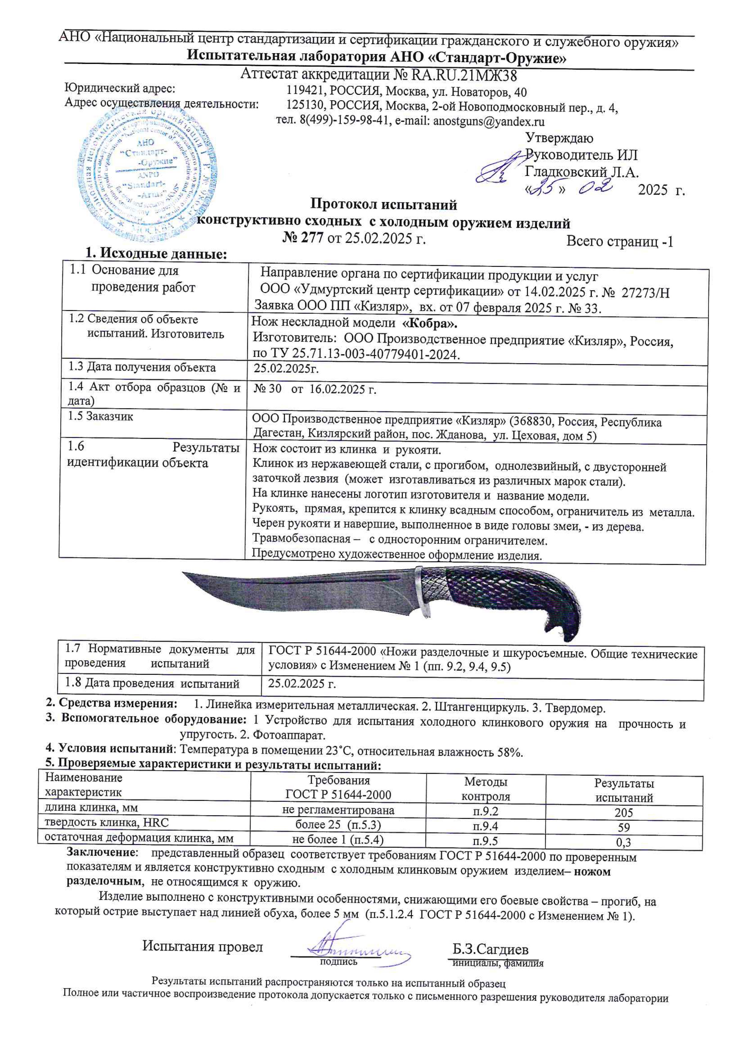 Авторский нож "Кобра", в глазах установлены полудрагоценные камни, а зубы выполнены из бивня мамонта. Данная задумка автора, показывает картину охоты змеи. Металлическая гарда на рукояти придает надежности хвата и покрыта серебром и имеет фактурный рисунок кожи змеи. Подставка выполнена из дерева граб.Сертификаты