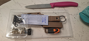 нож сделан аккуратно, облои только внизу клипсы. конструктивные особенности: хотелось бы рукоять на 10-15мм длиннее, а кольцо поболее (диаметр отверстия 18мм). конструктивные недостатки: клипса кажется очень тактической за счёт прорезей, но на 4 винта ставится только в положении поперёк ремня (рукоятью вниз или вверх на поясе). в любом другом положении ( вдоль ремня, под углом) в стандартные отверстия можно попасть лишь двумя винтами. нож тупой, причём имеется ощущение, что режущую кромку завалили шлифованием после заточки. |